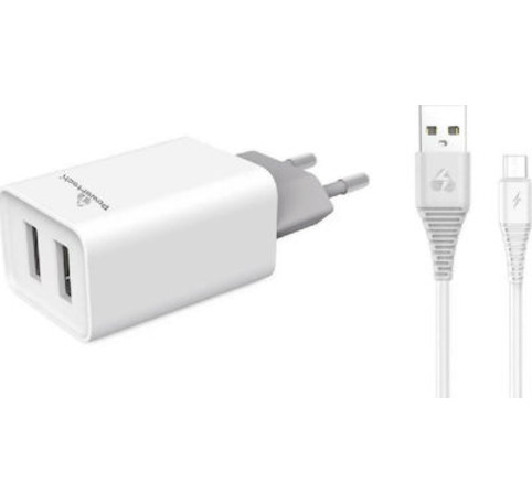Powertech Φορτιστής με 2 Θύρες USB-A και Καλώδιο micro USB Λευκός (PT-775)