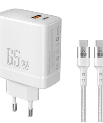 Powertech Φορτιστής GaN με Θύρα USB-A και Θύρα USB-C και Καλώδιο USB-C – USB-C 65W Quick Charge 2.0 Quick Charge 3.0 Λευκός (PT-1182)
