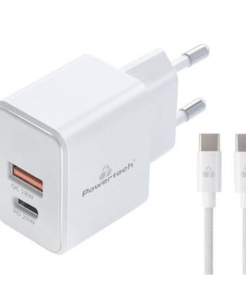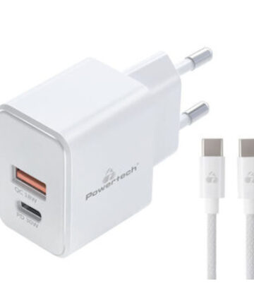 Powertech Φορτιστής GaN με Θύρα USB-A και Θύρα USB-C και Καλώδιο USB-C – USB-C 20W Power Delivery Quick Charge 3.0 Λευκός (PT-1248)