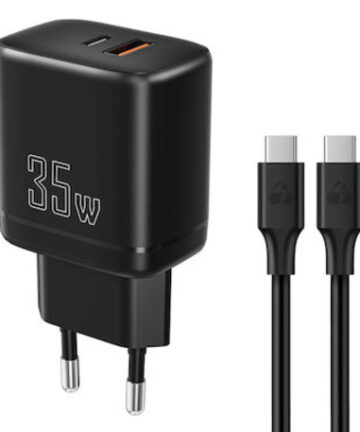 Powertech Φορτιστής GaN με Θύρα USB-A και Θύρα USB-C και Καλώδιο USB-C – USB-C 35W Quick Charge 3.0 Μαύρος (PT-1180)
